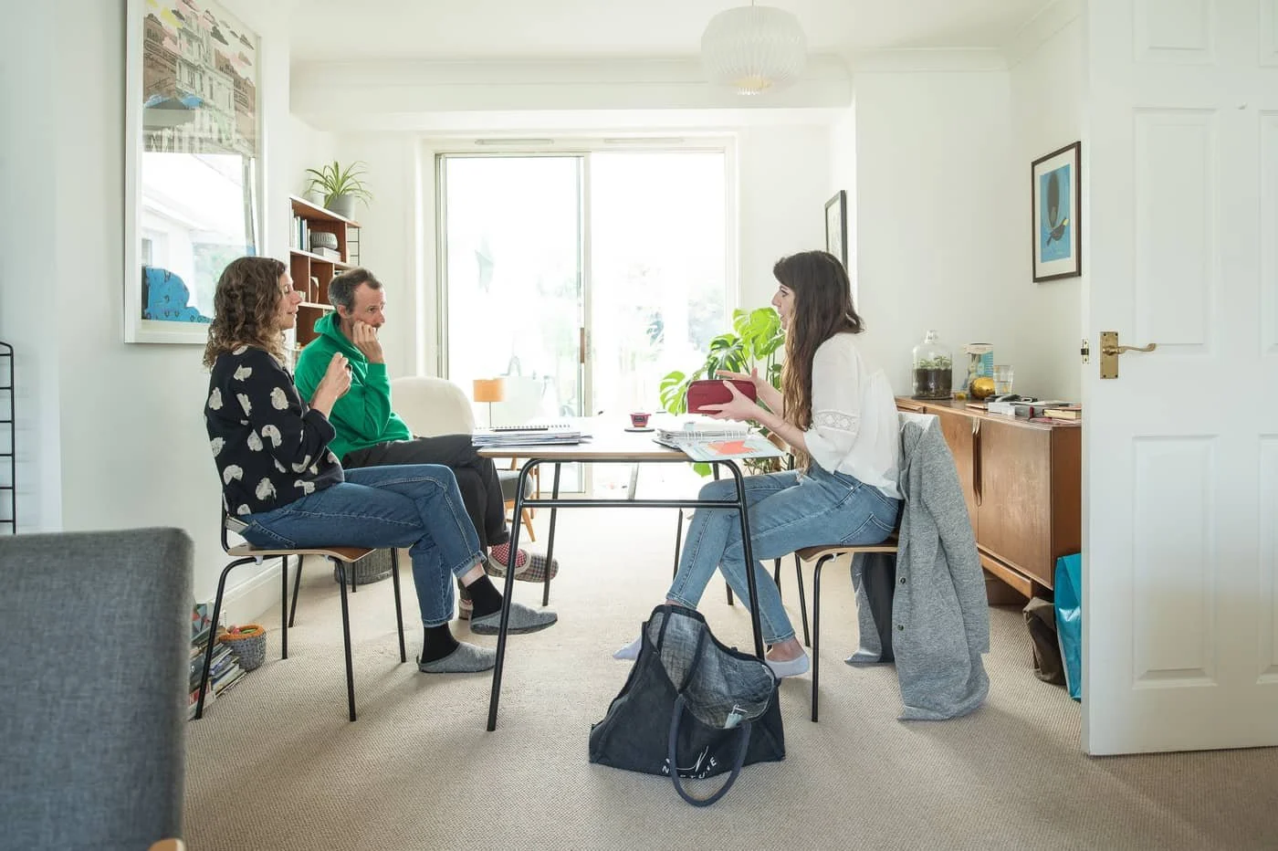 Fi talking through loft conversion plans and costs with jen & stu before the project got underway